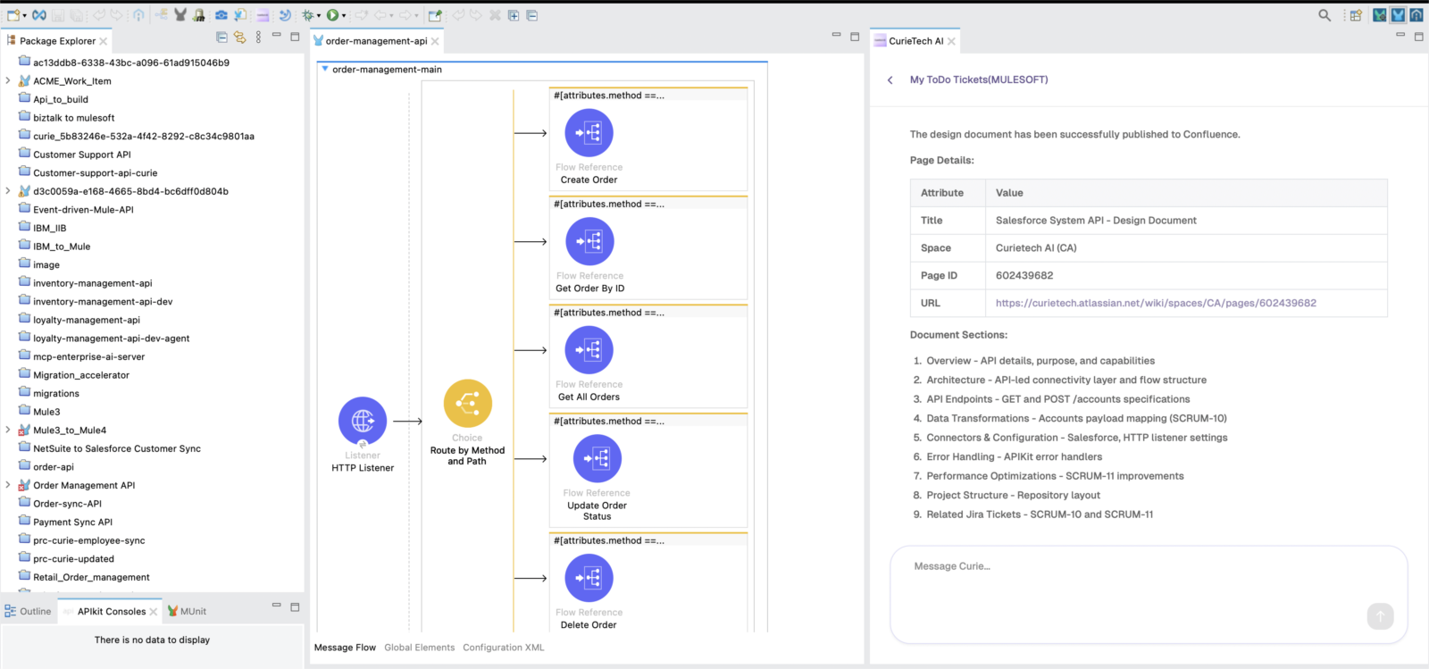 For MuleSoft developers, this means fewer distractions, clearer execution, and more time spent building integrations that matter. From managing APIs in Exchange to working on Jira tickets, updating Confluence documentation, testing flows, and building integrations inside the IDE, CurieTech AI supports the entire development lifecycle.